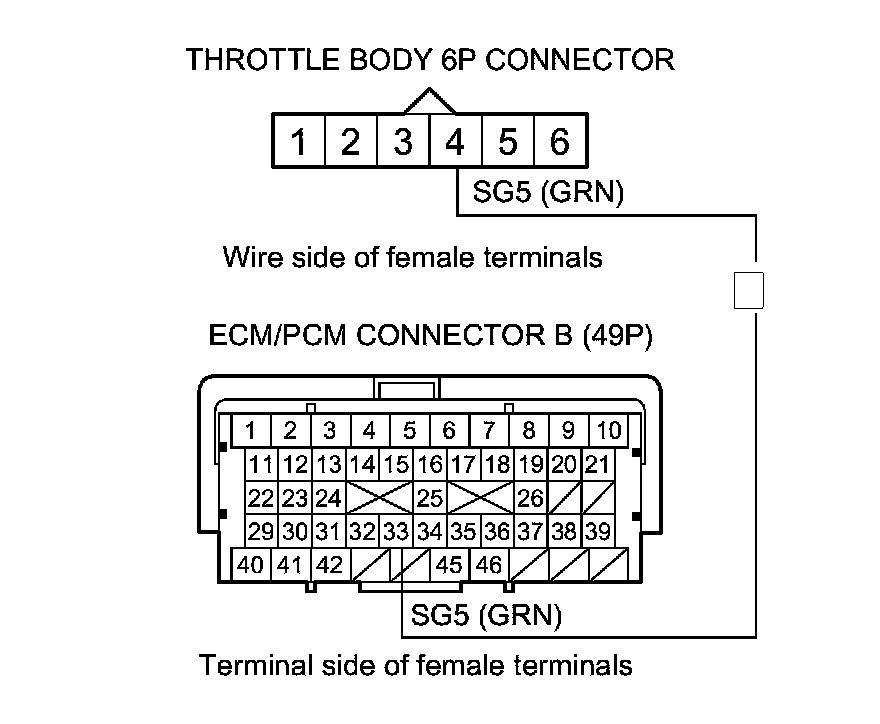 17. Check for continuity between ECM/PCM connector terminal B33 and throttle body 6P connector terminal No. 4.