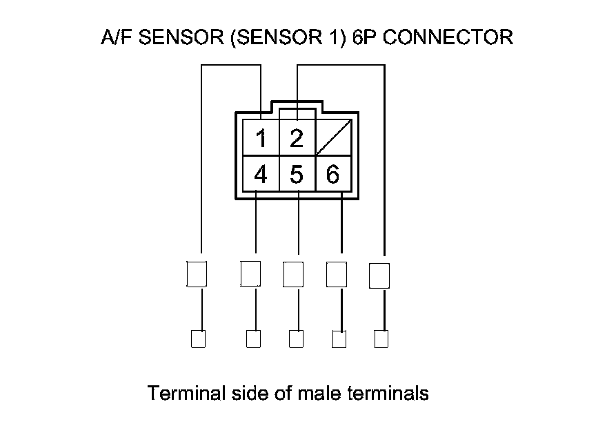 10. At the sensor side, measure the resistance between A/F sensor (Sensor 1) 6P connector terminals No. 1 and No. 2.