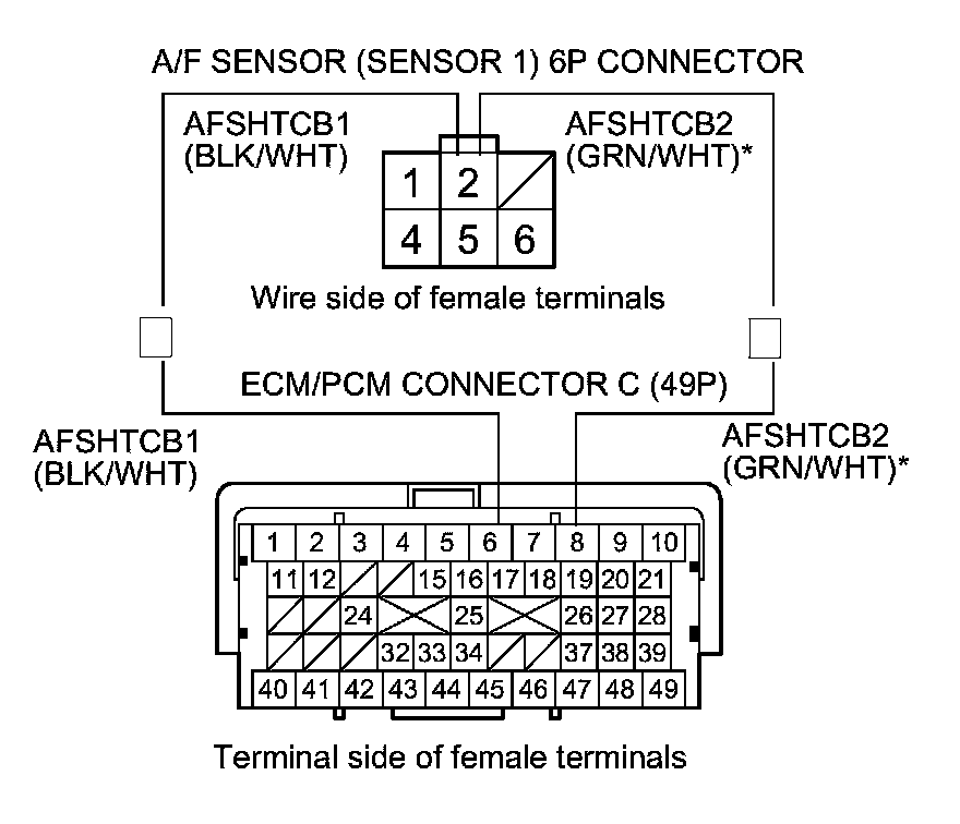 16. Check for continuity between A/F sensor (Sensor 1) 6P connector terminal No. 2 and ECM/PCM connector C6 (C8)*.