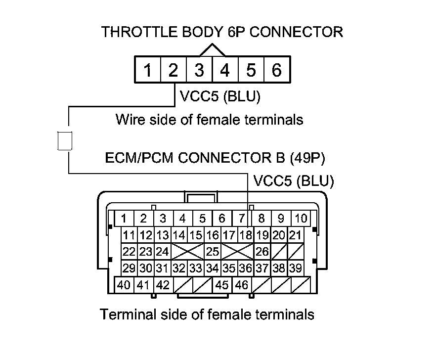 15. Check for continuity between ECM/PCM connector terminal B18 and throttle body 6P connector terminal No. 2.