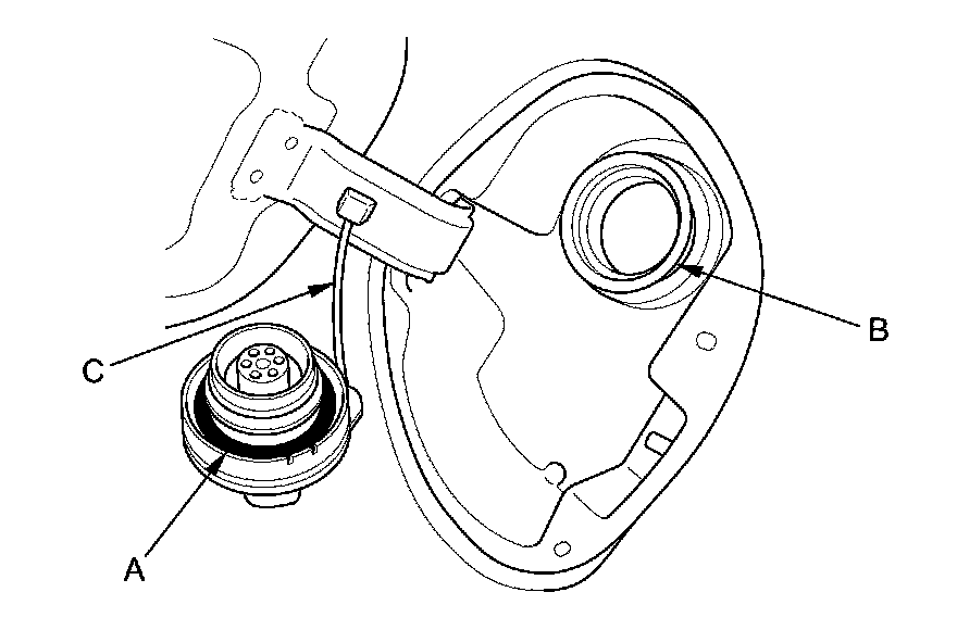 2. Check the fuel fill cap seal (A) and the fuel fill pipe mating surface (B). Verify that the fuel fill cap tether cord (C) is not caught under the cap.