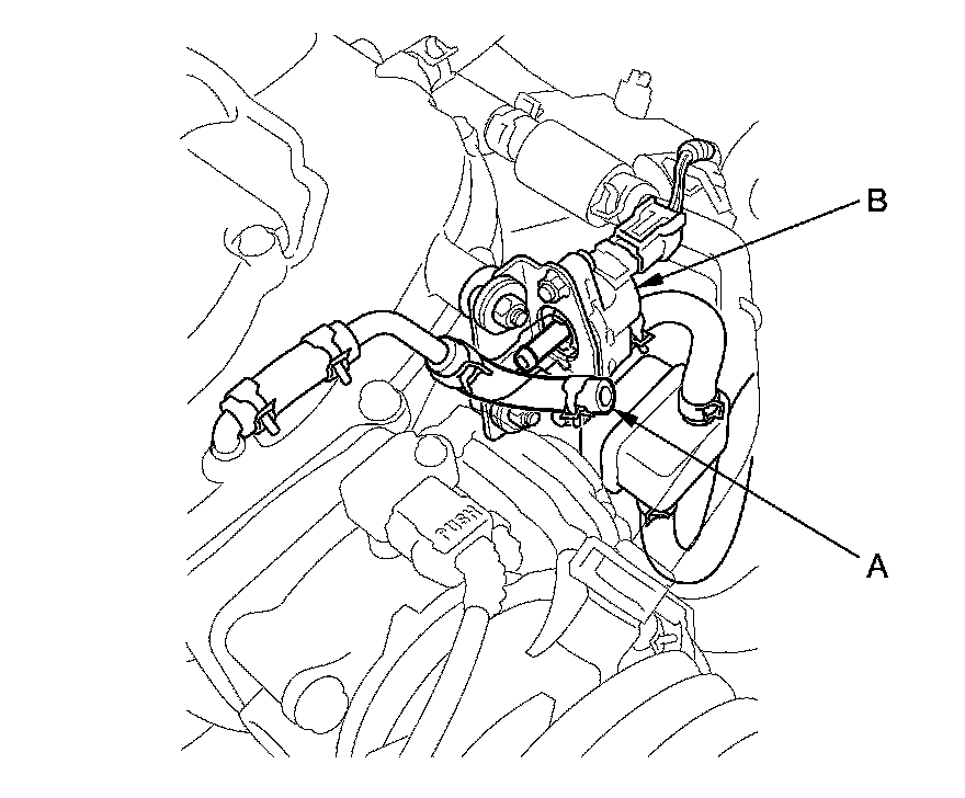 6. Disconnect the vacuum hose (A) from the EVAP canister purge valve (B).