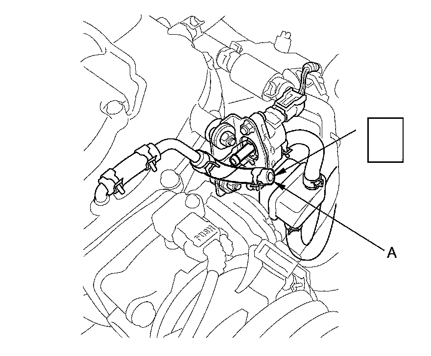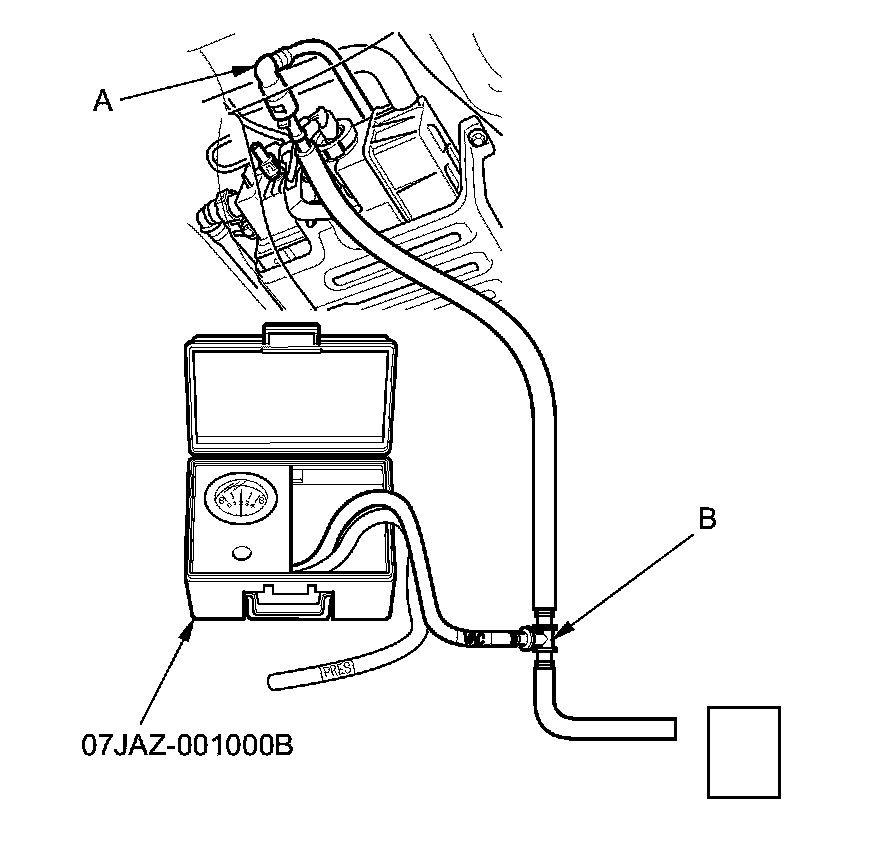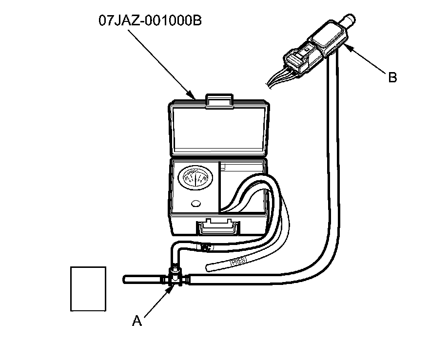 7. Disconnect the vacuum hose (A) from the purge line (at the EVAP canister side), then connect a T-fitting (B) from the vacuum gauge, and connect the vacuum pump/gauge, 0-30 in.Hg, to the hose as shown.