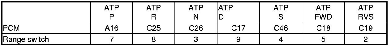 2. Compare the ATPP, ATPR, ATPN, ATPD, ATPS, ATPFWD, and ATPRVS inputs with the HDS to the following table, in each shift lever position.
