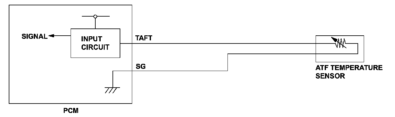 The ATF temperature sensor is a thermistor type sensor that changes resistance according to the change in ATF temperature. The powertrain control module (PCM) sends a 5 V reference voltage to the sensor through a pull-up resistor. When the ATF temperature is low, the sensor resistance increases and the PCM detects a high signal voltage. As the ATF temperature rises, the sensor resistance decreases and the PCM detects a low signal voltage. When the ATF temperature sensor signal voltage to the PCM is under the specification, indicating that the temperature is above the specification (a short to ground), a malfunction is detected and stores a DTC.