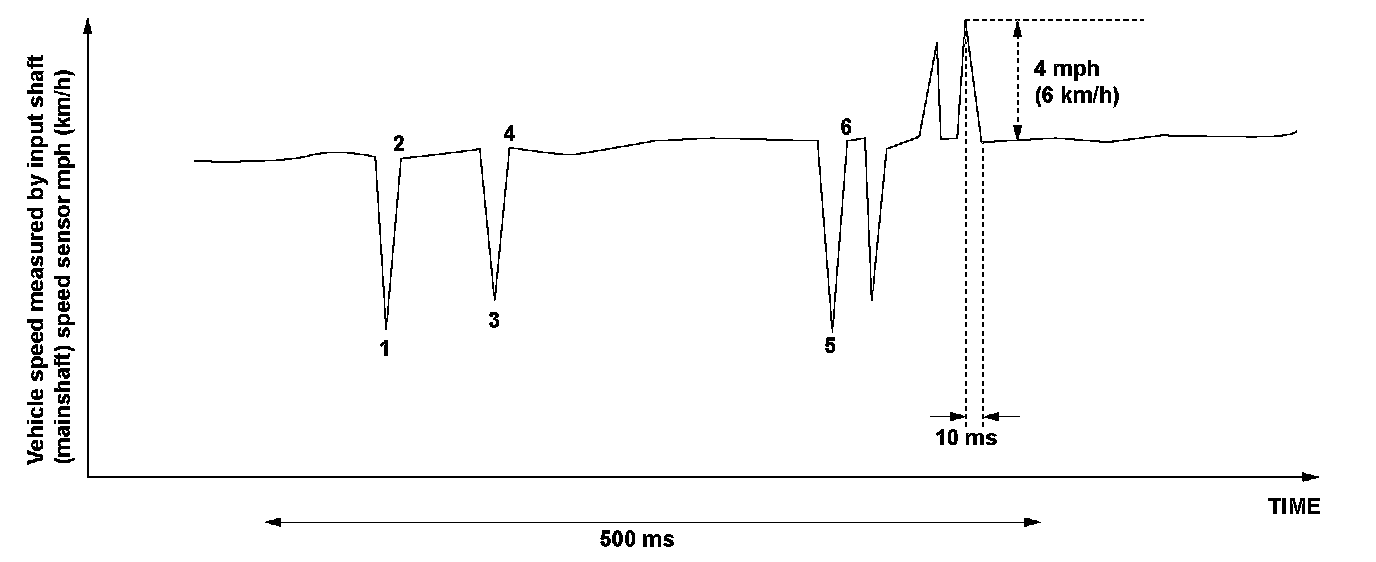 The fluctuation of the vehicle speed measured by the input shaft (mainshaft) speed sensor in 10 milliseconds is 4 mph (6 km/h) or more, and it fluctuates at least six times within 500 milliseconds.