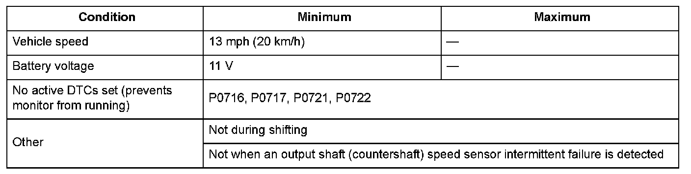 The input shaft (mainshaft) speed sensor is attached to the outside of the transmission housing. The input shaft (mainshaft) speed sensor generates a pulsing signal according to the speed of the idler gear on the input shaft (mainshaft). Using that signal, the powertrain control module (PCM) determines the speed of the input shaft (mainshaft). If no pulses occur with the input shaft (mainshaft) rotating, the PCM detects a malfunction that may be caused by an open, a temporary open, or a short to ground. Based on the fluctuation of the vehicle speed measured by the input shaft (mainshaft) speed sensor, a malfunction is detected and a DTC is stored.