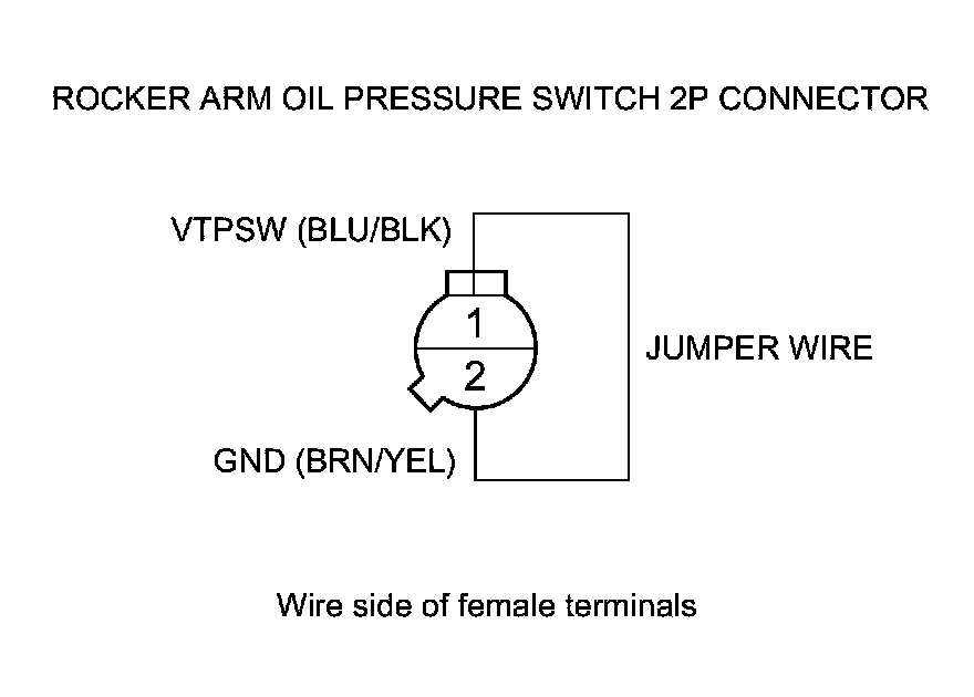 7. Connect rocker arm oil pressure switch 2P connector terminals No. 1 and No. 2 with a jumper wire.