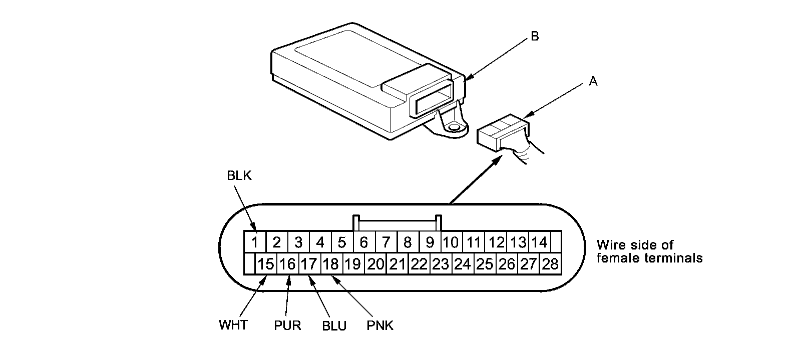 2. Inspect the connector (A) and socket (B) terminals for a good pin fit to be sure they are all making good contact.