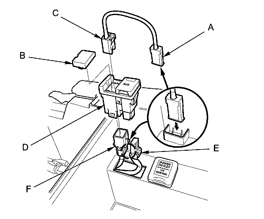 3. Carefully pull out the auxiliary jack assembly (D) from the center console box, then disconnect the 5P connector (E) and remove the USB adapter cable connector (F).