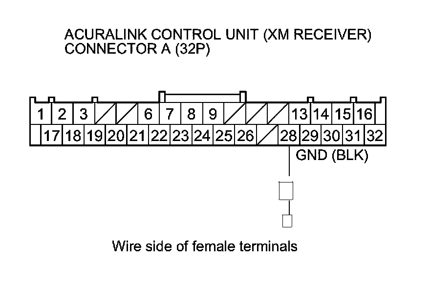 Repair an open or high resistance in the wire between AcuraLink control unit (XM receiver) connector A (32P) terminal No. 28 and body ground (G501) Harness Locations.�