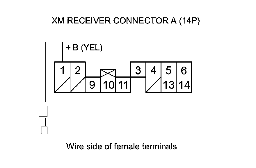 15. Measure the voltage between XM receiver connector A (14P) terminal No. 1 and body ground.