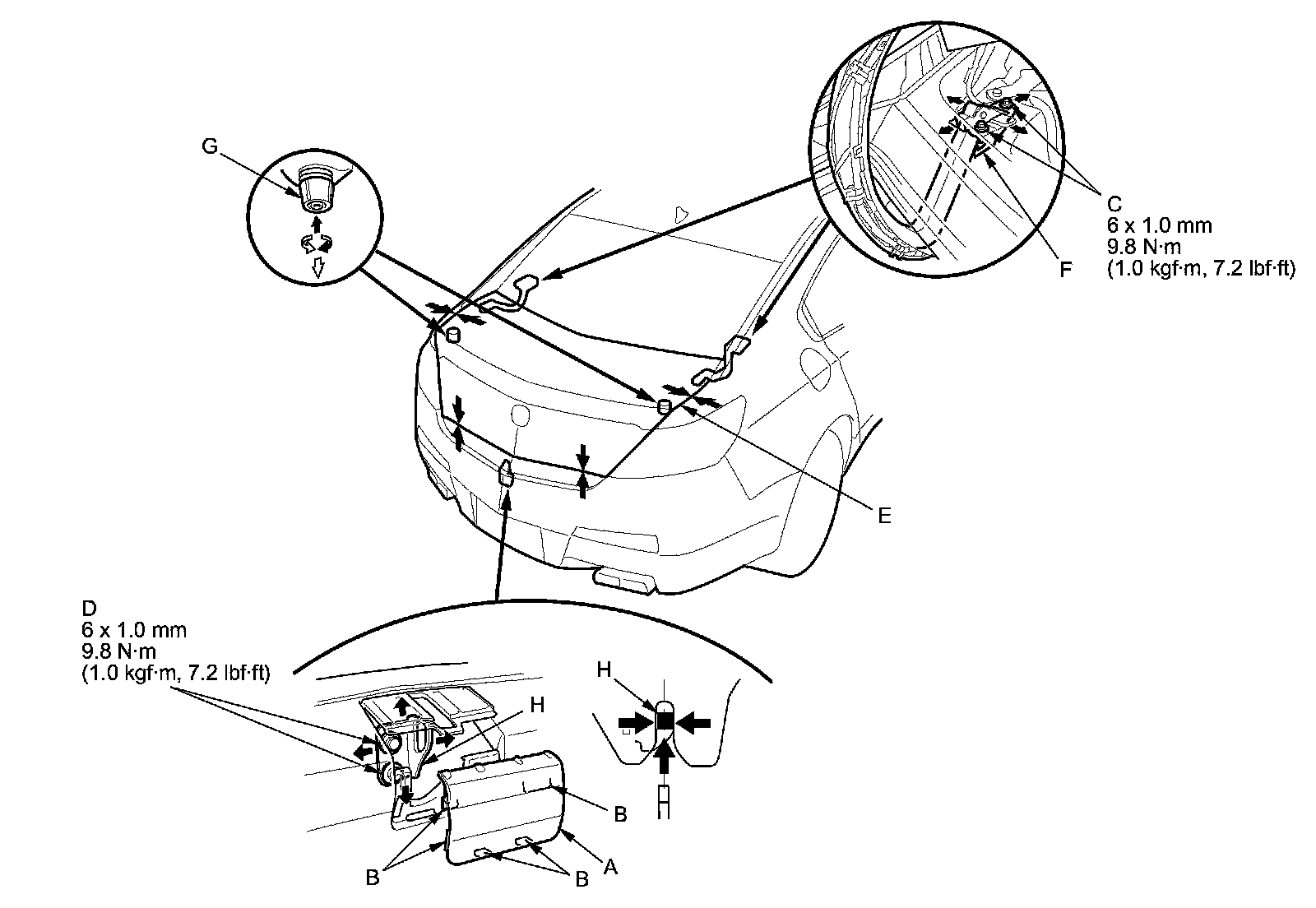 - Adjust the fit between the trunk lid and the trunk lid latch by moving the striker (H).