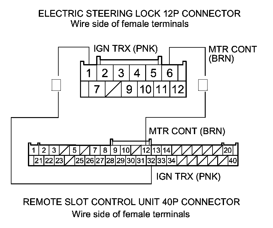 23. Check for continuity between electric steering lock 12P connector terminals No. 1 and No. 6, and remote slot control unit 40P connector terminals No. 32 and No. 12 respectively.