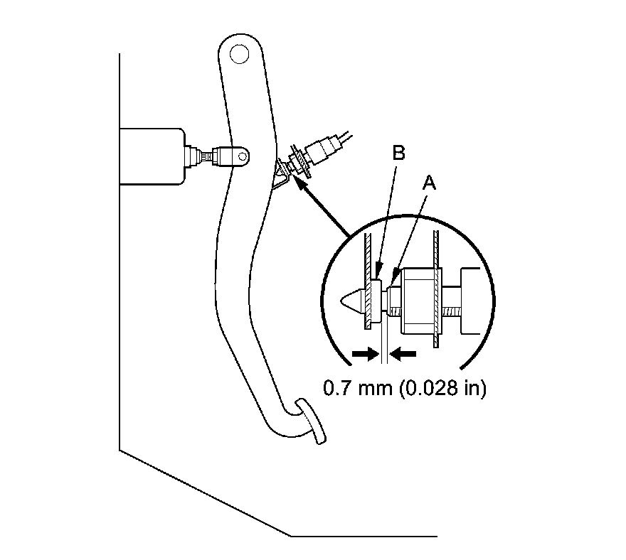 8. Lift up on the brake pedal by hand. Push in the brake pedal position switch until its plunger is fully pressed (threaded end (A) touching the pad (B) on the pedal arm). Turn the switch 45 ° clockwise to lock it. The gap between the brake pedal position switch and the pad is automatically adjusted to 0.7 mm (0.028 in) by locking the switch. Make sure the brake lights go off when the pedal is released.
