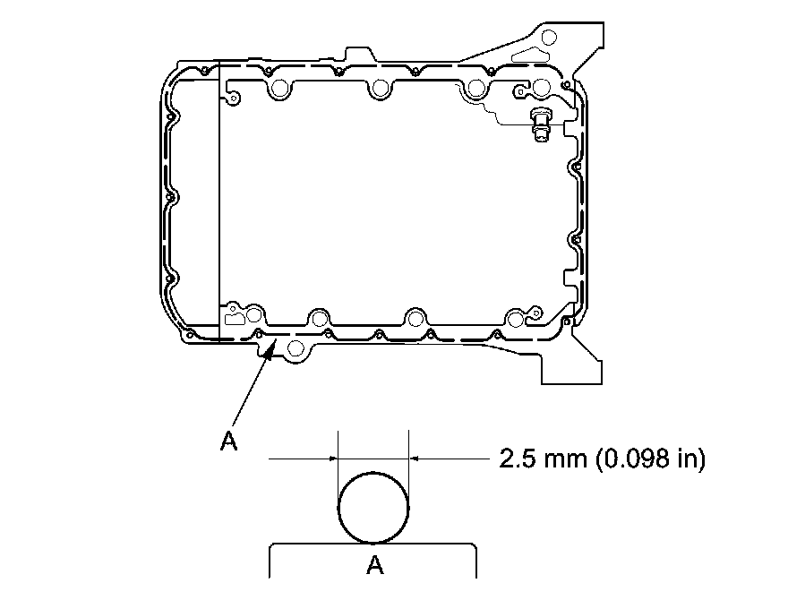 - Apply a 2.5 mm (0.098 in) diameter bead of liquid gasket along the broken line (A).