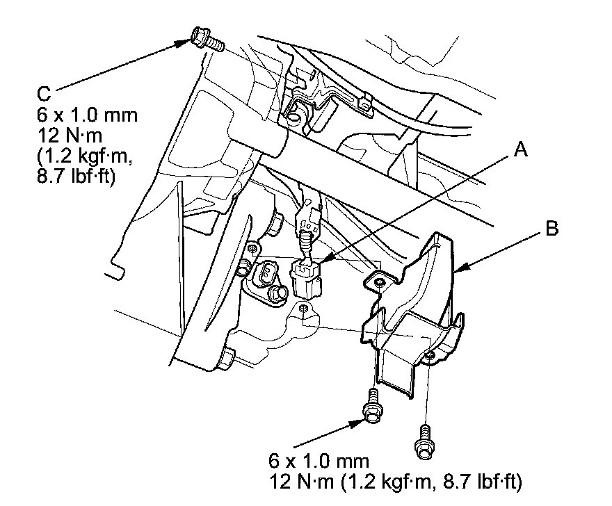 7. Connect the crankshaft position (CKP) sensor connector (A), then install the CKP sensor cover (B) and the bolt (C).