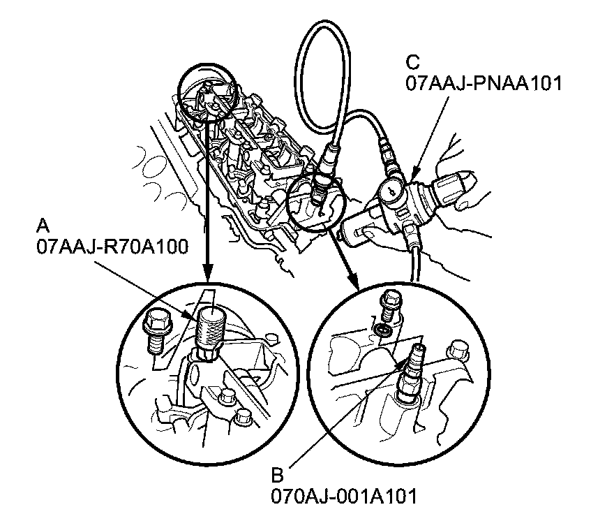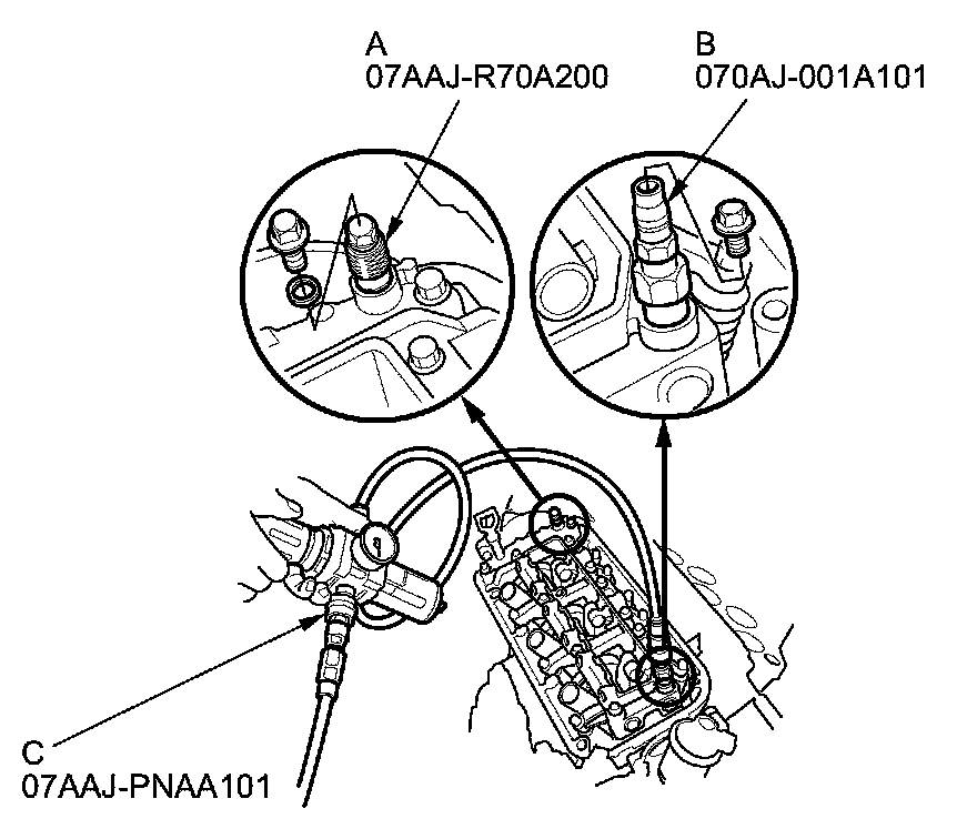 7. Remove the sealing bolts, then install the VTEC air stop tool B (A) and the VCM air adapter (B) to the inspection hole, then connect the air pressure regulator (C) as shown.