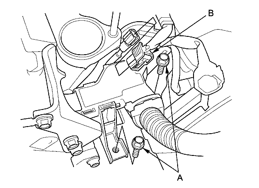 4. Remove the harness holder mounting bolts (A) and disconnect the knock sensor connector (B).