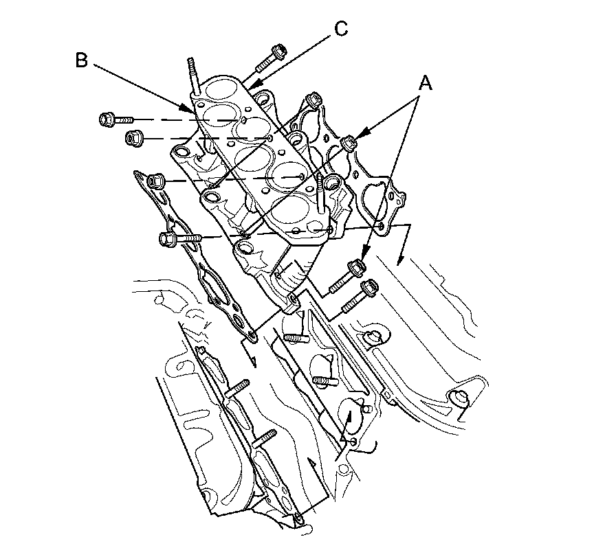 5. Remove the injector base mounting bolts/nuts (A), then remove the front injector base (B) and the rear injector base (C).