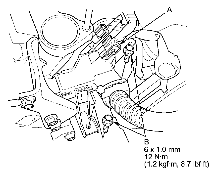 2. Connect the knock sensor connector (A), then install the harness holder mounting bolts (B).