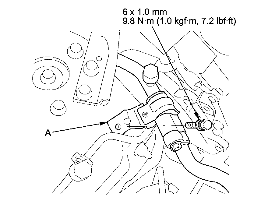 2. Remove the bolt from the A/C line clamp (A).