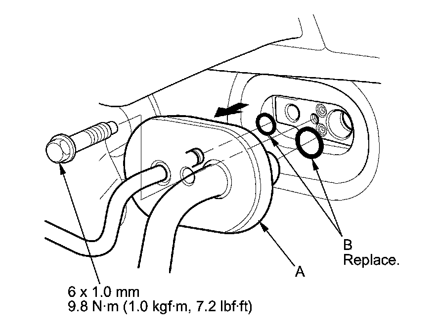 3. Remove the bolt, then disconnect the A/C line (A) from the evaporator core. Replace the O-rings (B).