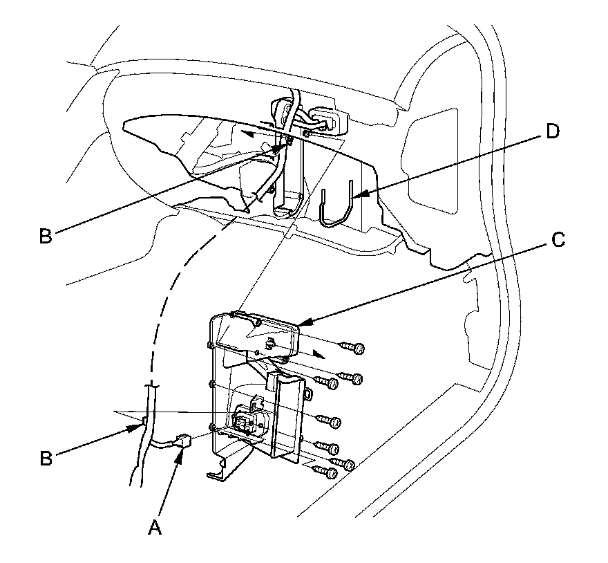 5. Disconnect the power transistor connector (A). Detach the harness clip (B). Remove the self-tapping screws, the joint duct (C), and the seal (D).