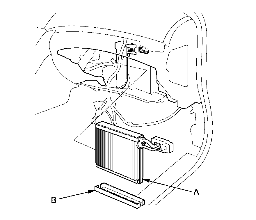 6. Carefully pull out the evaporator core (A) without bending the lines, then remove the plate (B).