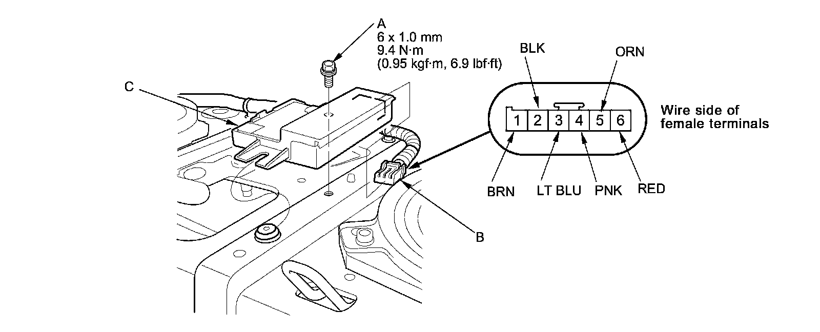2. Remove the bolts (A), then disconnect the 6P connector (B) from the electrical compass unit (C) and remove it.