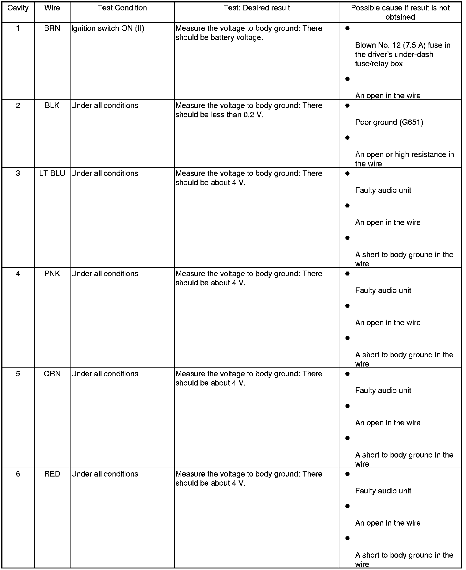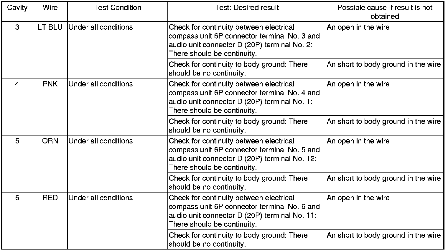 5. Disconnect the 6P connector from the electrical compass unit, disconnect the audio unit connector D (20P), and do the following input tests at the connectors.