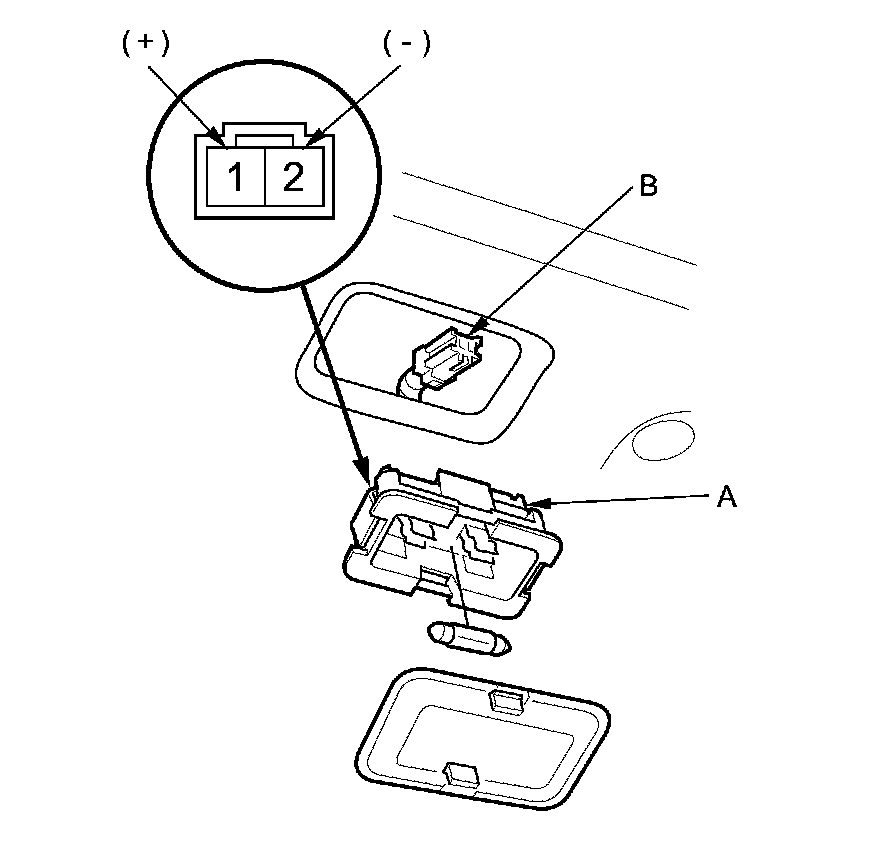 4. Check for continuity between terminals No. 1 (+) and No. 2 (-). There should be continuity. If there is no continuity, check the bulb. If the bulb is OK, replace the trunk light assembly.