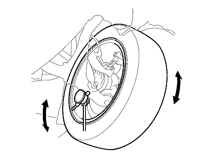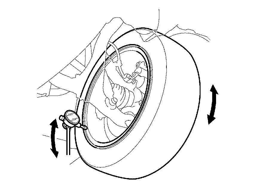 5. If the wheel runout is not within the specification, check the wheel bearing end play Testing and Inspection, and make sure the mating surfaces on the brake disc or the brake disc/drum and the inside of the wheel are clean.