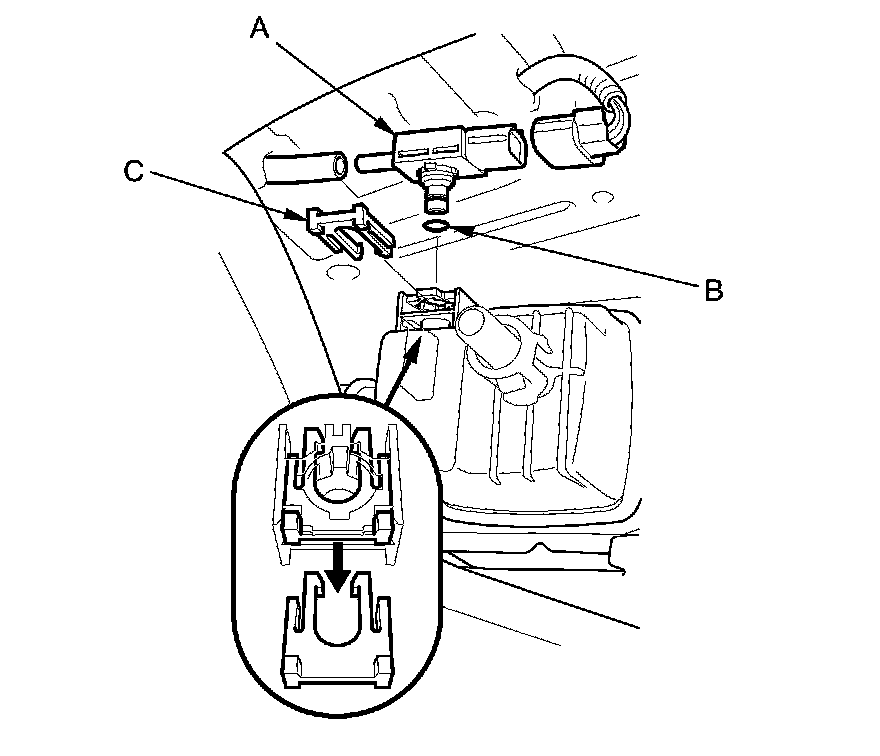 4. Install the parts in the reverse order of removal with a new O-ring (B) and a new retainer (C).