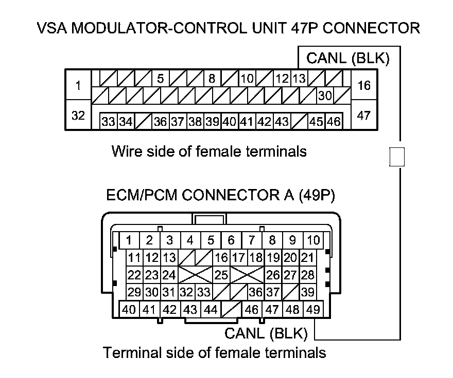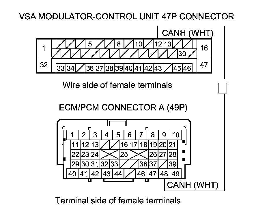 12. Check for continuity between ECM/PCM connector terminals A49 and VSA modulator-control unit 47P connector terminal No. 13.