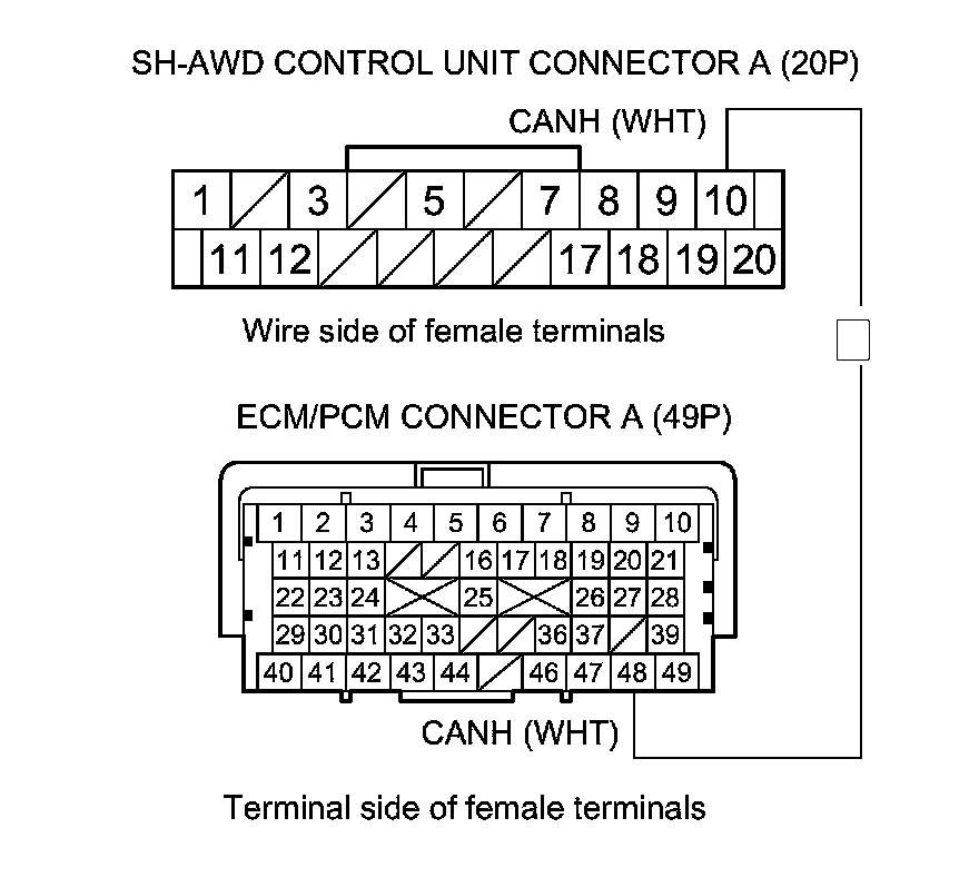 10. Check for continuity between ECM/PCM connector terminals A48 and SH-AWD control unit connector A (20P) terminal No. 10.