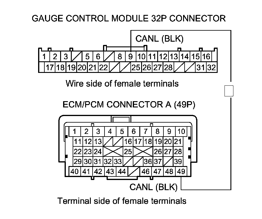 11. Check for continuity between ECM/PCM connector terminals A49 and gauge control module 32P connector terminal No. 9.