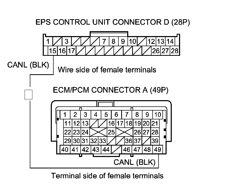 13. Check for continuity between ECM/PCM connector terminals A49 and EPS control unit connector D (28P) terminal No. 15.