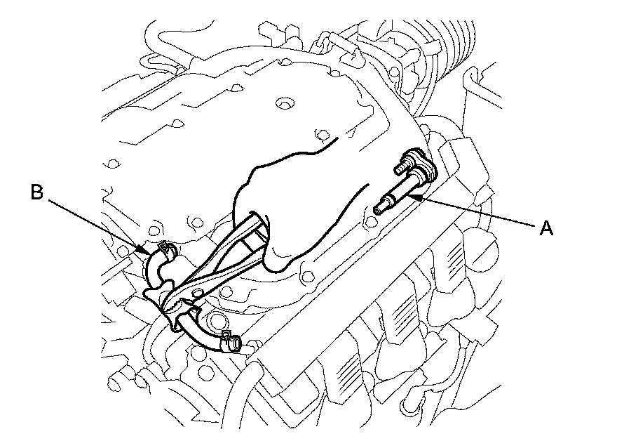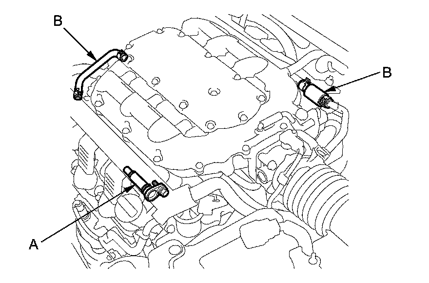 1. Check the PCV valve (A), the hoses (B), and connections for leaks or restrictions.