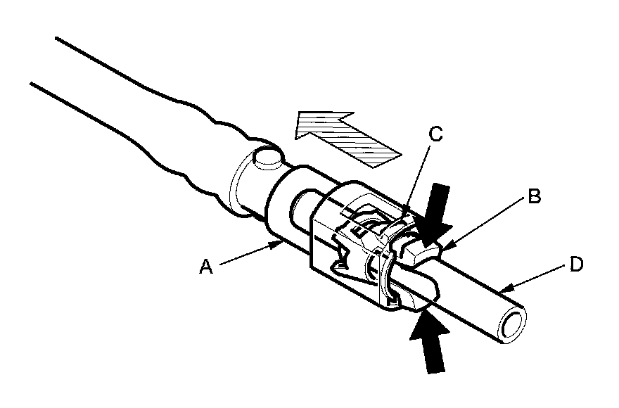 4. Place a rag or a shop towel over the quick-connect fitting. Hold the connector (A) with one hand, and squeeze the retainer tabs (B) with the other hand to release them from the locking tabs (C). Pull the connector off.