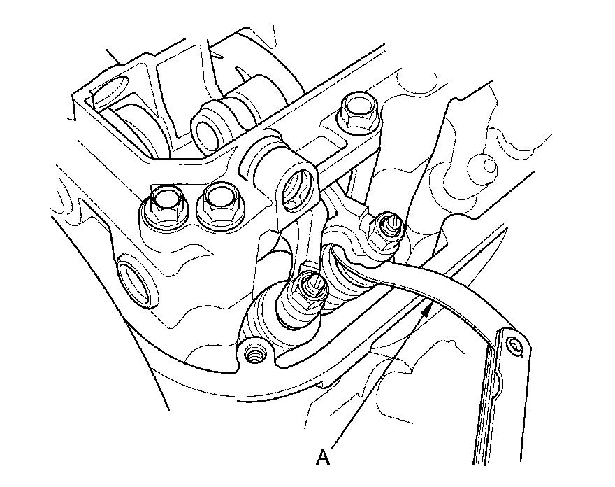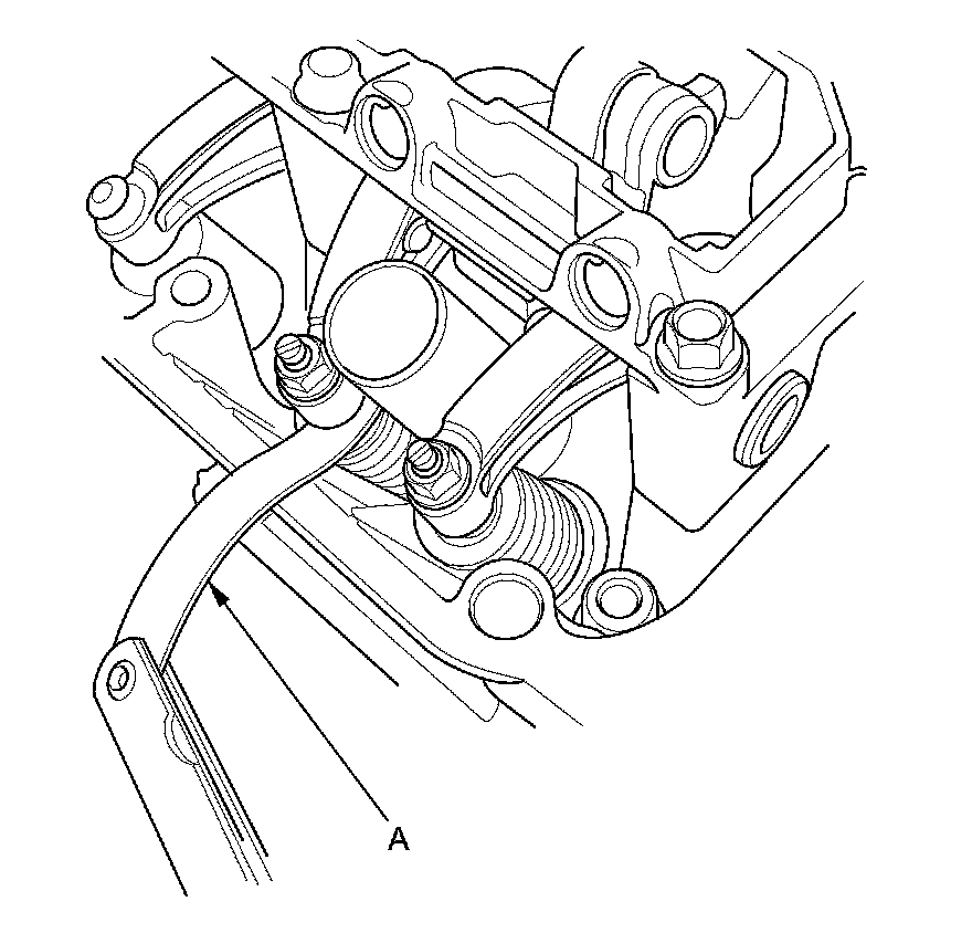 4. Insert the feeler gauge (A) between the adjusting screw and the end of the valve stem on the No. 1 cylinder, and slide it back and forth; you should feel a slight amount of drag.