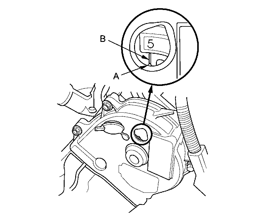 11. Rotate the crankshaft clockwise. Align the pointer (A) on the front upper cover with the No. 5 piston TDC mark (B) on the front camshaft pulley.