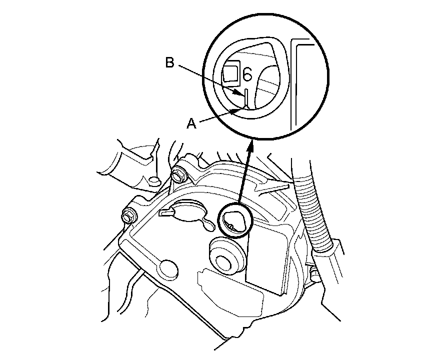 15. Rotate the crankshaft clockwise. Align the pointer (A) on the front upper cover with the No. 6 piston TDC mark (B) on the front camshaft pulley.