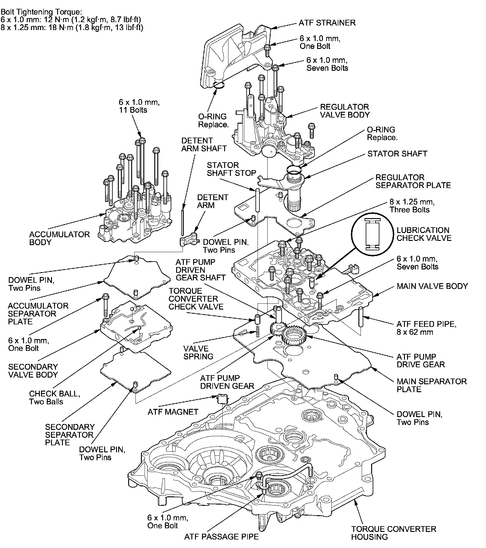 5. If the ATF pump drive gear and the ATF pump driven gear shaft do not move smoothly, loosen the main valve body bolts. Realign the ATF pump driven gear shaft, and retighten the bolts to the specified torques, then recheck. Failure to align the ATF pump driven gear shaft correctly will result in a seized ATF pump drive gear or ATF pump driven gear shaft.