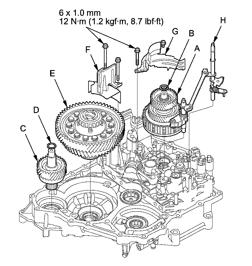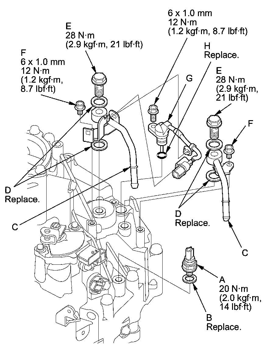 71. Secure the ATF cooler lines with the 6.0 mm bolts (F). Tighten the bolts to 12 Nm (1.2 kg-m, 8.7 lb-ft).