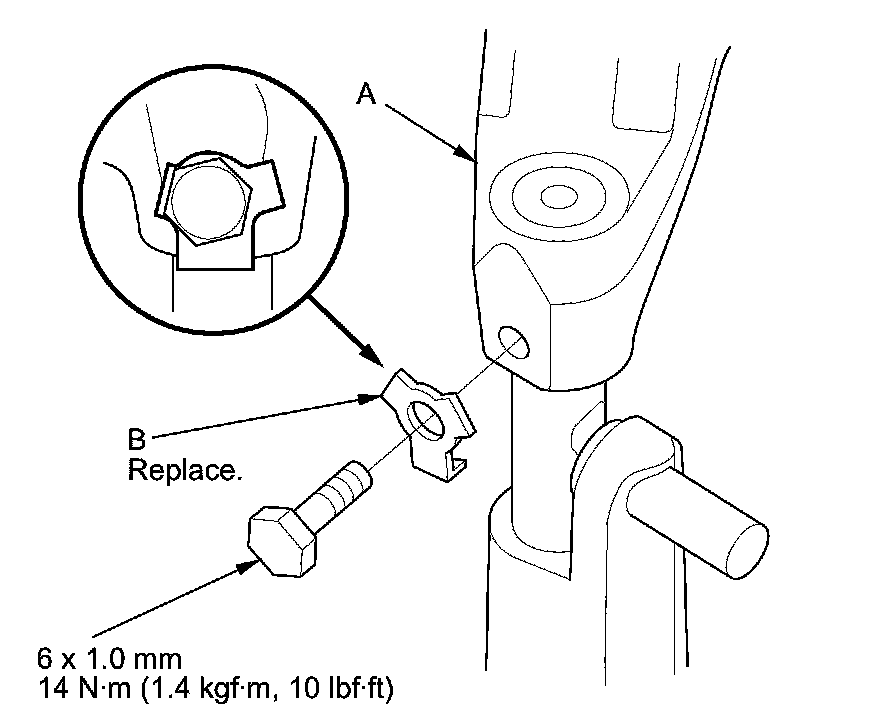 27. Secure the shift fork (A) to the shift fork shaft with the lock bolt and a new lock washer (B), then bend the lock tab of the lock washer against the bolt head.