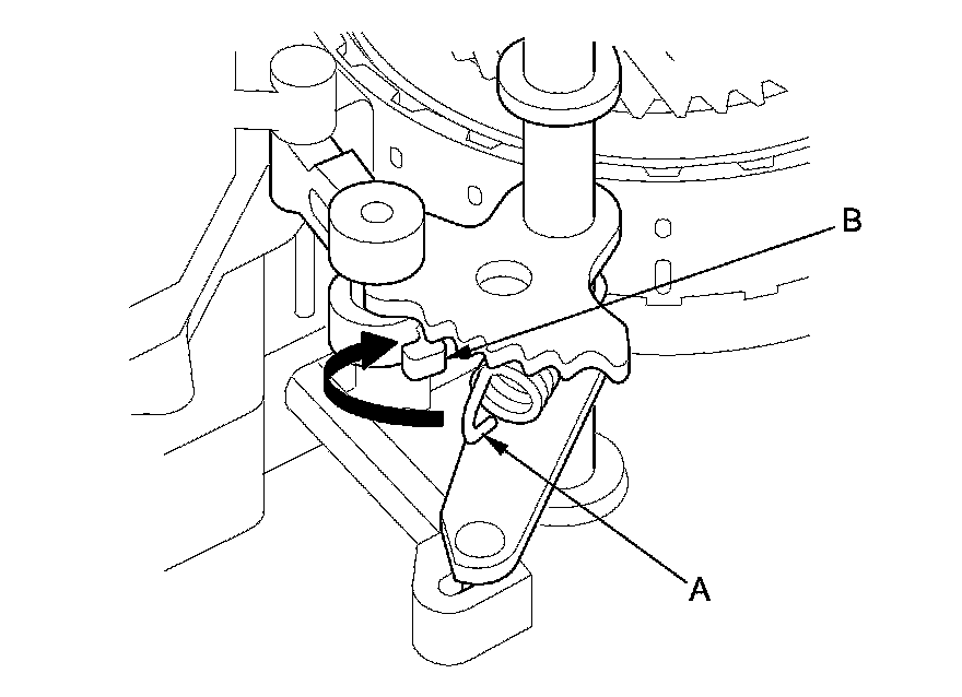 25. Turn the shift fork shaft (B) so the large chamfered hole is facing the fork bolt hole of the shift fork.
