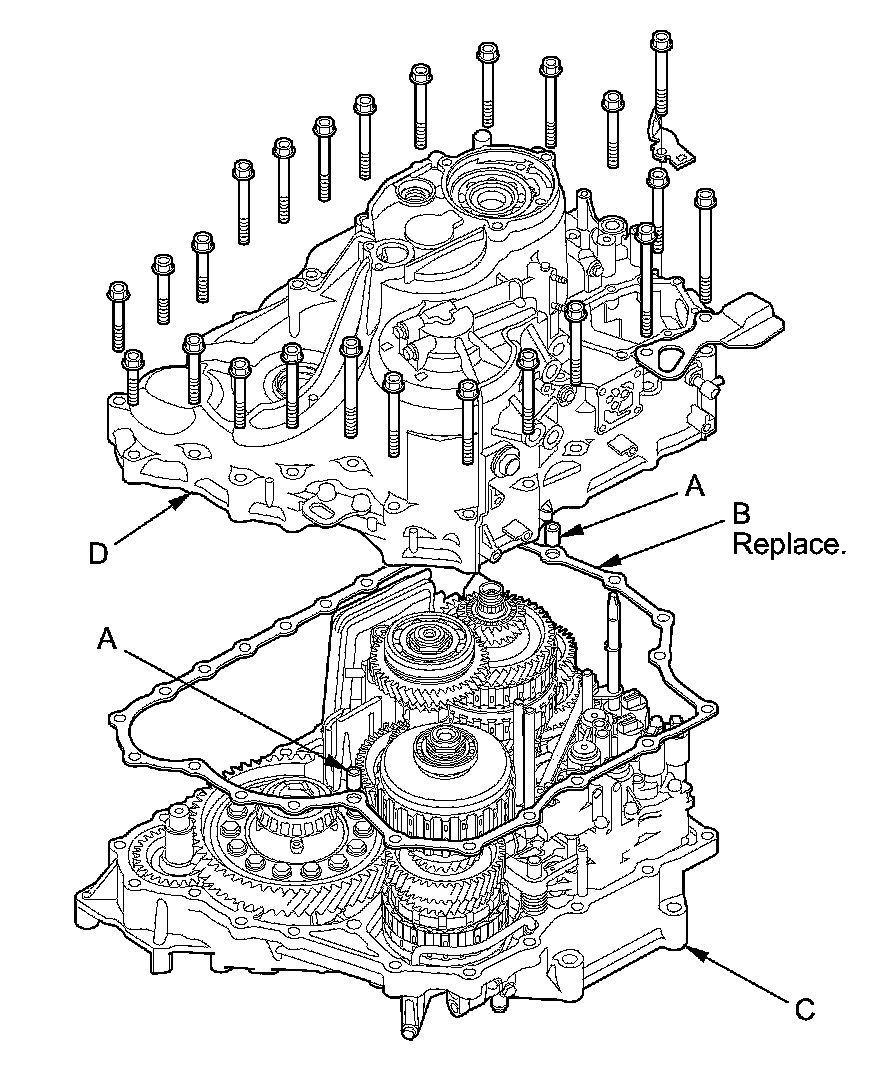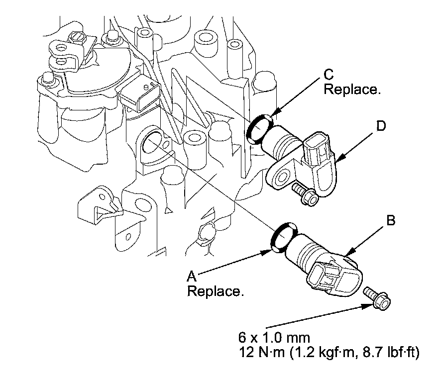 67. Install a new O-ring (C) on the output shaft (countershaft) speed sensor (D), and install the output shaft (countershaft) speed sensor.