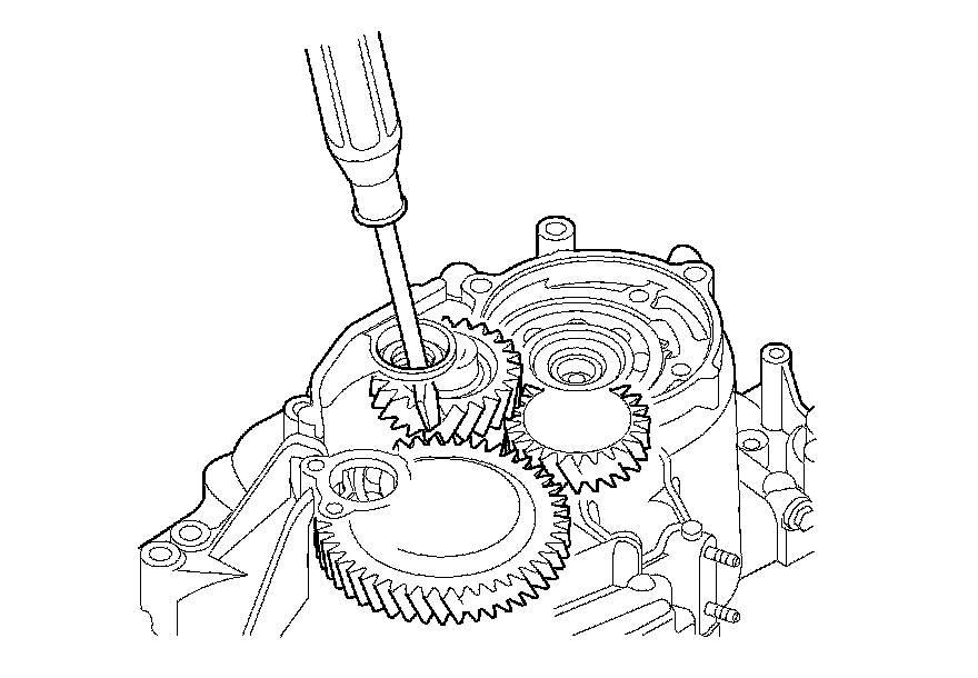 35. Wrap a screwdriver tip with tape to prevent damage to the reverse idler gear teeth. Engage the reverse idler gear with the reverse gears by rotating the idler gear using a screwdriver.