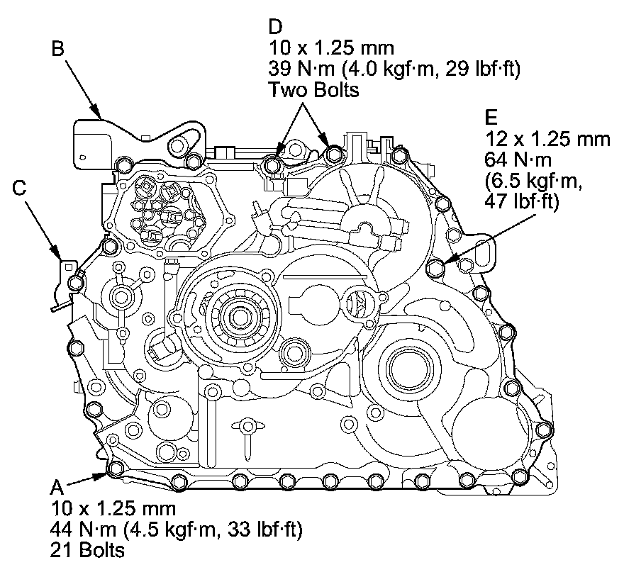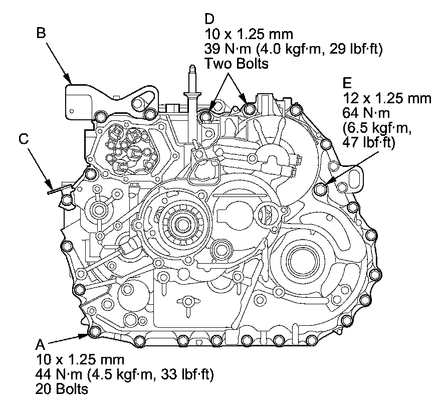 39. Install and tighten the 12 x 1.25 mm bolt (E) to 64 Nm (6.5 kg-m, 47 lb-ft).